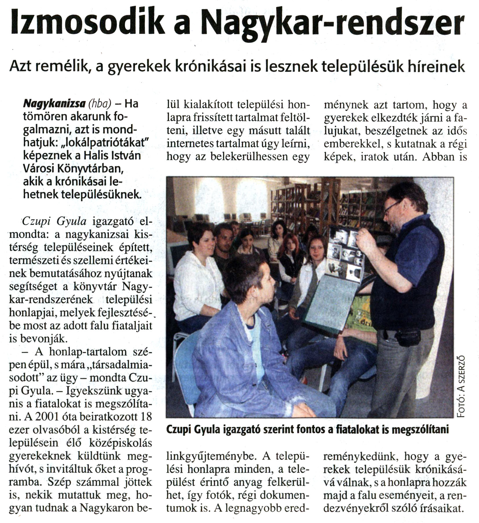 Nyilvános 13433 | 27056 | Zalai Hírlap 2008. június 9. 133. szám 12. oldal - Izmosodik a Nagykar-rendszer | A cikk szövege: Izmosodik a Nagykar-rendszer Azt remélik, a gyerekek krónikásai is lesznek településük híreinek Nagykanizsa (hba) - Ha tömören akarunk fogalmazni, azt is mondhatjuk: „lokálpatriótákat" képeznek a Halis István Városi Könyvtárban, akik a krónikásai lehetnek településüknek. Czupi Gyula igazgató elmondta: a nagykanizsai kistérség településeinek épített, természeti és szellemi értékeinek bemutatásához nyújtanak segítséget a könyvtár Nagykar-rendszerének települési honlapjai, melyek fejlesztésébe most az adott falu fiataljait is bevonják. - A honlap-tartalom szépen épül, s mára „társadalmiasodott" az ügy - mondta Czupi Gyula. - Igyekszünk ugyanis a fiatalokat is megszólítani. A 2001 óta beiratkozott 18 ezer olvasóból a kistérség településein élő középiskolás gyerekeknek küldtünk meghívót, s invitáltuk őket a programba. Szép számmal jöttek is, nekik mutattuk meg, hogyan tudnak a Nagykaron belül kialakított települési honlapra frissített tartalmat feltölteni, illetve egy másutt talált internetes tartalmat úgy leírni, hogy az belekerülhessen egy linkgyűjteménybe. A települési honlapra minden, a települést érintő anyag felkerülhet, így fotók, régi dokumentumok is. A legnagyobb eredménynek azt tartom, hogy a gyerekek elkezdték járni a falujukat, beszélgetnek az idős emberekkel, s kutatnak a régi képek, iratok után. Abban is reménykedünk, hogy a gyerekek településük krónikásává válnak, s a honlapra hozzák majd a falu eseményeit, a rendezvényekről szóló írásaikat. Képaláírás: Czupi Gyula igazgató szerint fontos a fiatalokat is megszólítani |